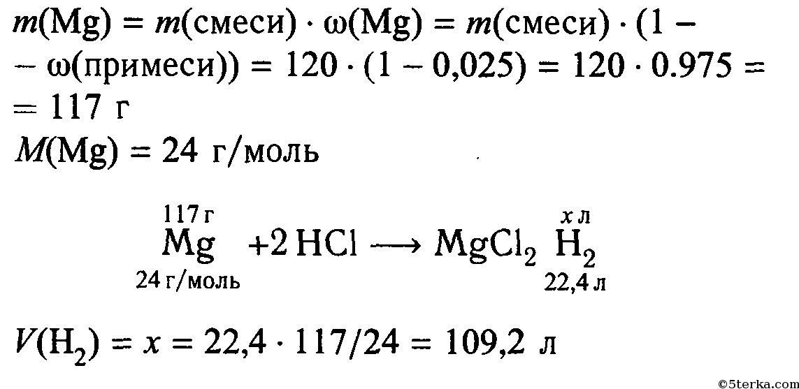 Рассчитать объем водора, который выделится при , взаимодействии 120 г магния, солержашего 2,5% примесей с соляной кислотой?