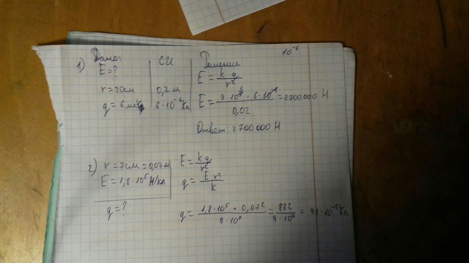 Помогите!!!!!!!!!Срочно!!!!!!!!!!Даю 25 баллов!!!!!!!1)Какова напряженность электрического поля на расстоянии 20см от точечного заряда 6мккл .2)Найдите заряд создающий электрическое поле если на расстоянии 7 см от заряда напряженность поля 1,8•10 5н/кл