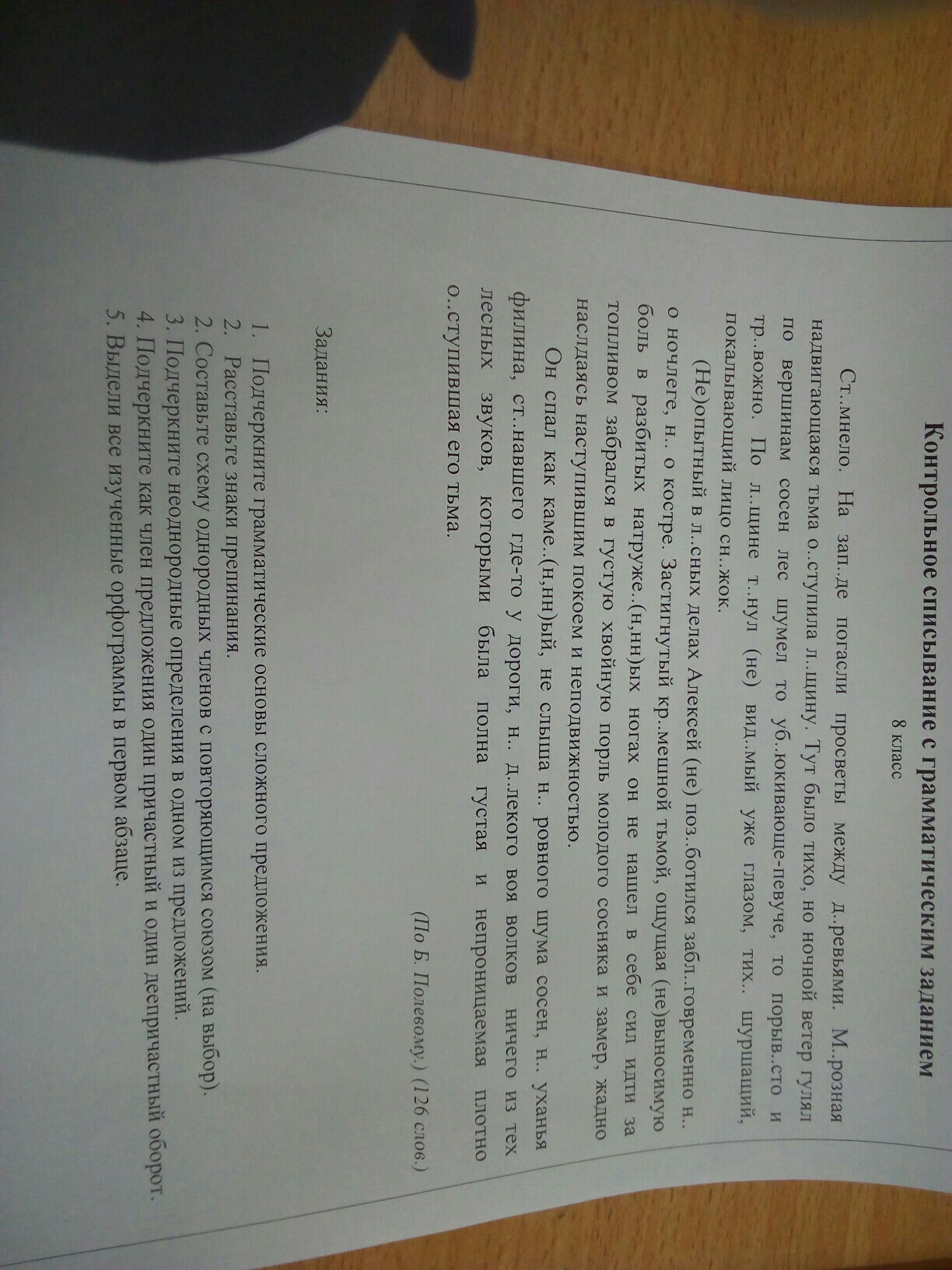 Неопытный в лесных делах Алексей не позаботился заблаговременно ни о ночлеге, ни о костре.(сложное) Застигнутый кромешной тьмой, ощущая невыносимую боль в разбитых натруженных ногах, он не нашел в себе сил идти за топливом, забрался в густую хвойную порль молодого сосняка и замер, жадно наслаждаясь наступившим покоем и неподвижностью .
