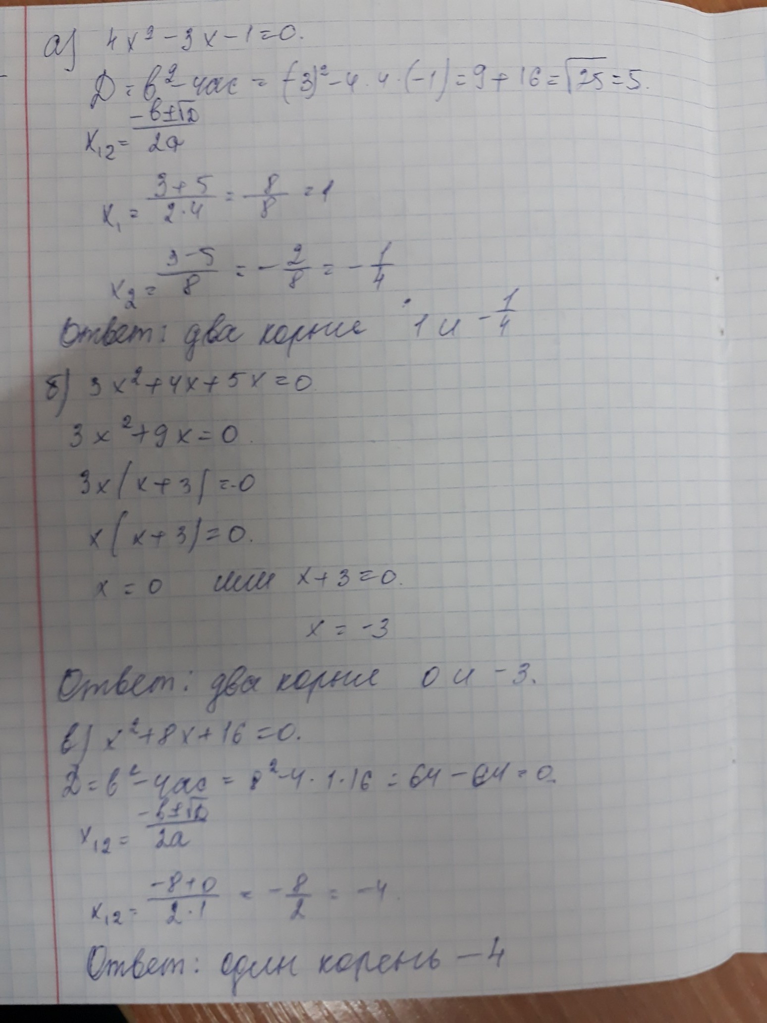 даны уравнения: а) 4х²-3х-1=0; б) 3х²+4х+5х=0; в) х²+8х+16=0 Определите, сколько корней имеет каждое уравнение. Найдите корни, если они существуют.