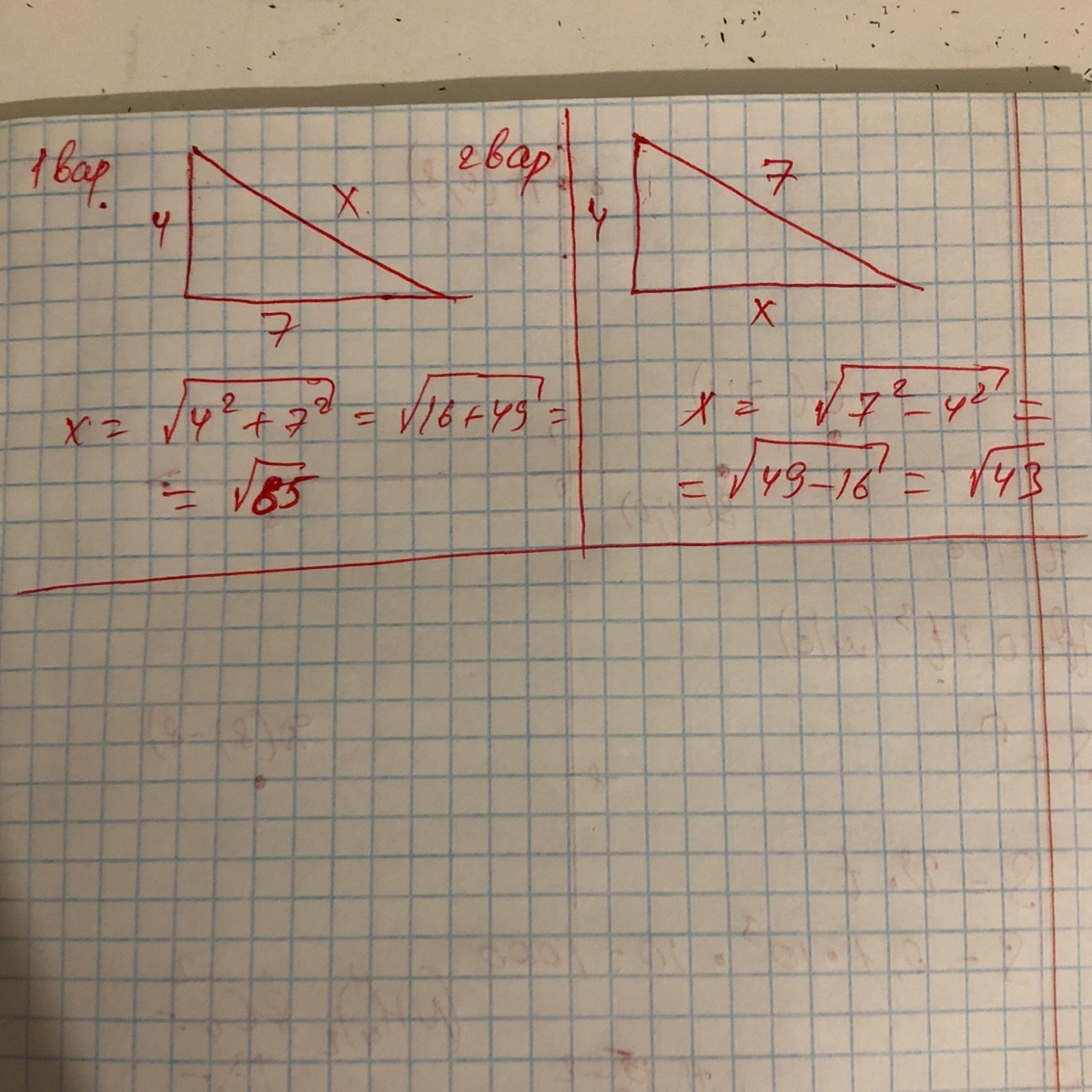 две стороны прямоугольного треугольника равны 4 см и 7 см. Найдите третью сторону треугольника. расмотрите все возможные варианты