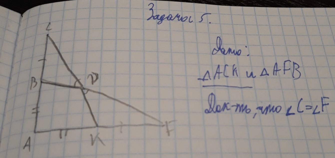 Так как тр. АСК = тр. АFB по условию, то АВ=АK. В равных треугольниках против равных сторон лежат равные углы, следовательно уг.С=уг. F.