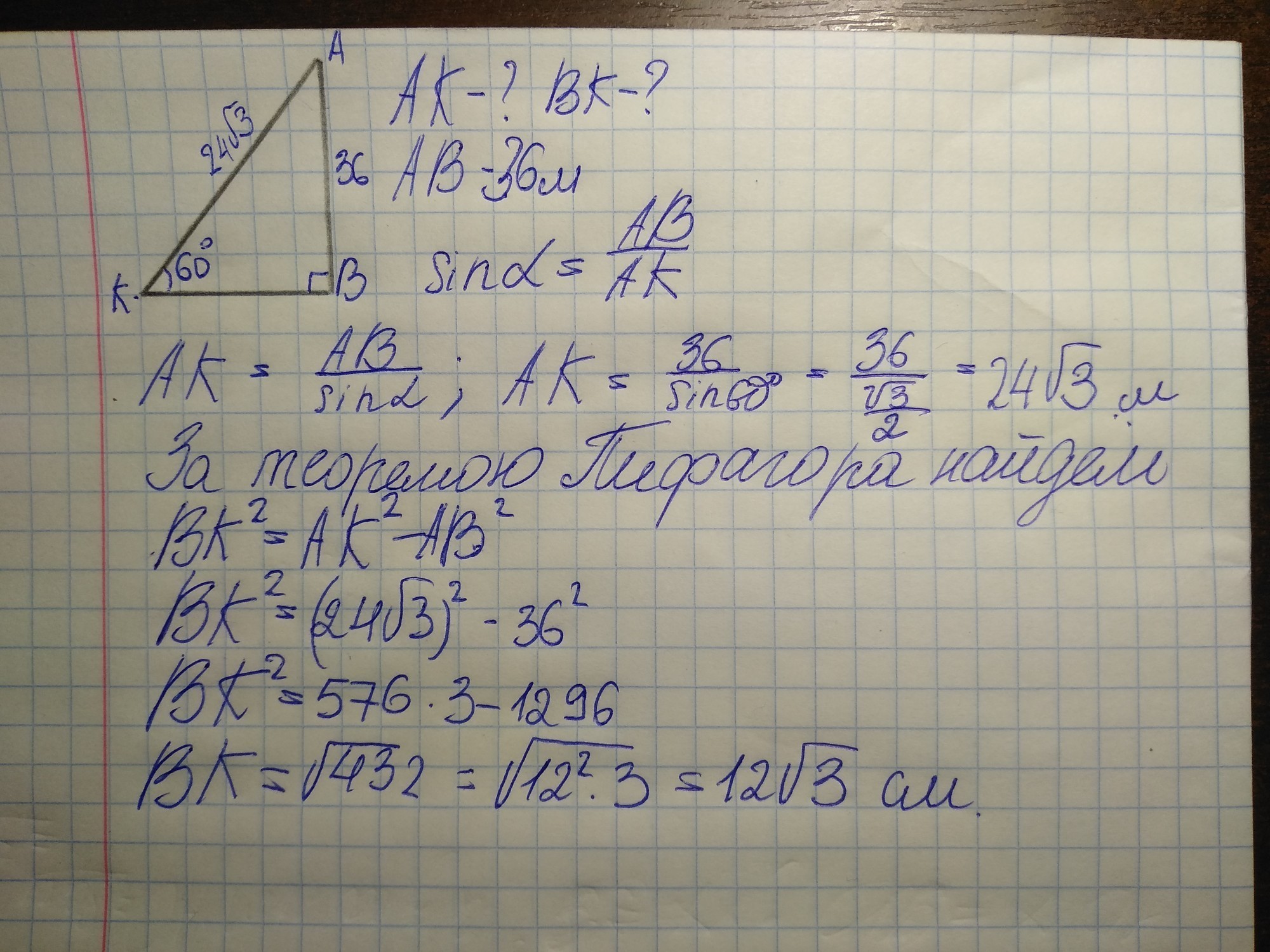 Вертикальная башня высотой 36 м видна из точки K на поверхности земли под углом 60°.Найдите расстояние от точки К до основания башни и до самой высокой точки башни.