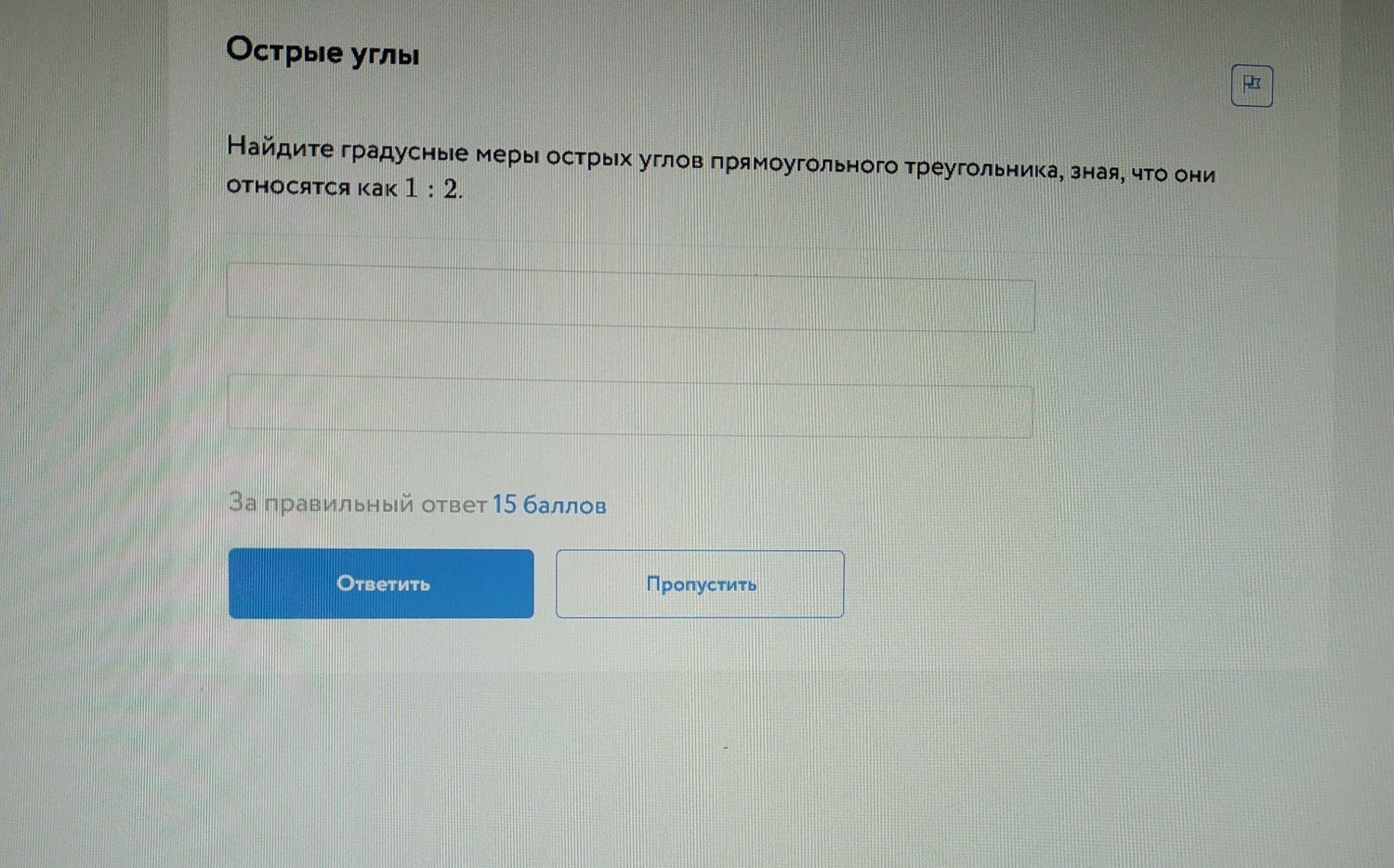 Найдите градусные меры острых углов прямоугольного треугольника , зная, что они относятся как 1:2