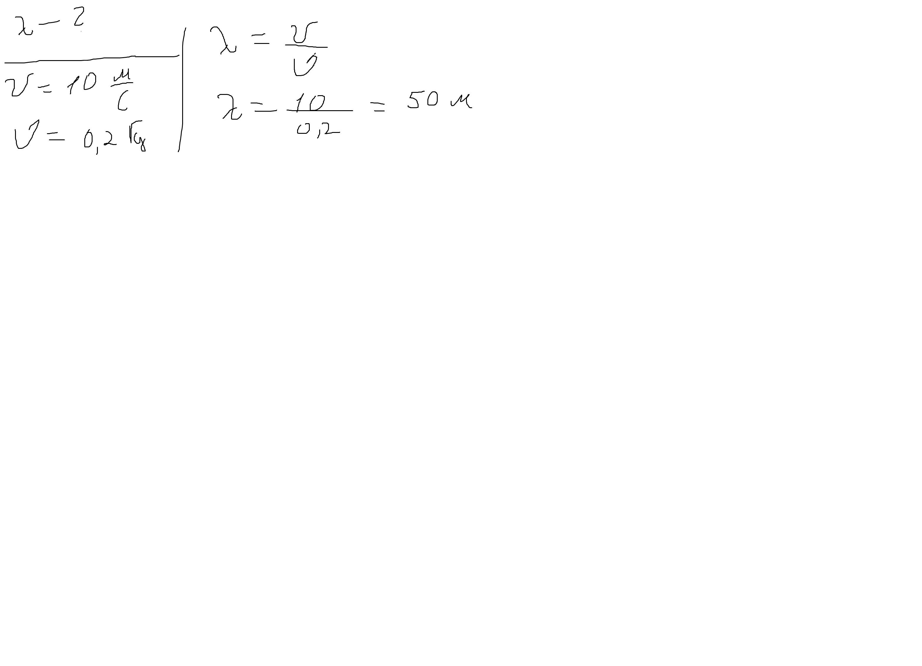 наидие длину волны распространшся со скростю 10мс если чистица волне калебается с чистотои 0;2 Гц