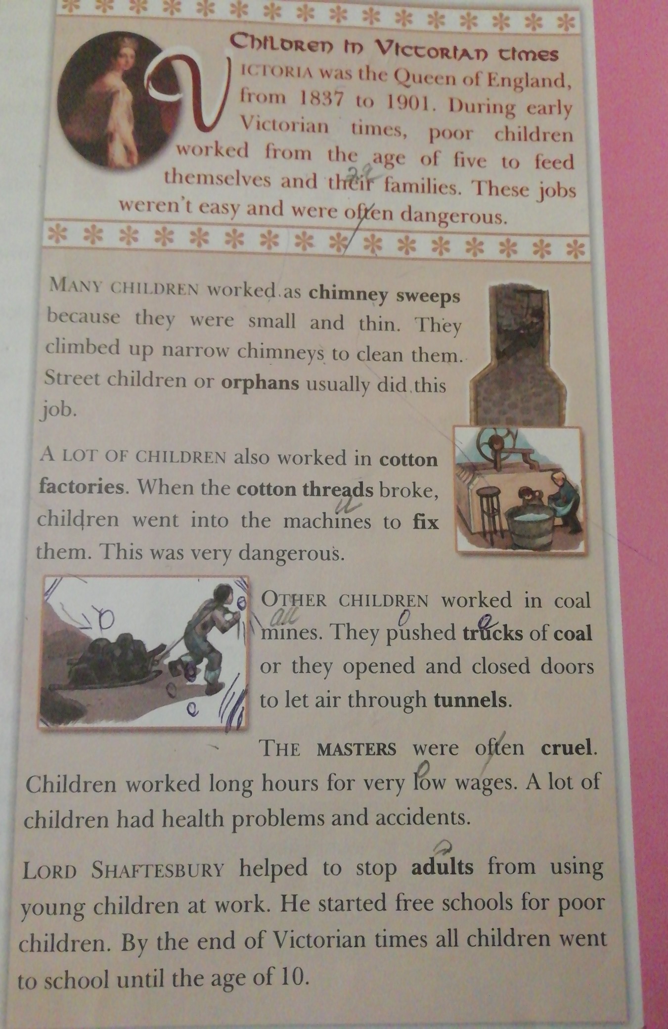 Вікторія була королевою Англії з 1837 до 1901. Під час раніх часів Вікторії, бідні діти працювали з п’яти років щоб прогодувати себе і свою сім’ю. Ці роботи не були легкі і часто небезпечні.