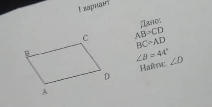 Смотри вообщем АВСД-паралелаграмм значит противолежащие углы равны значит Д-44 градуса