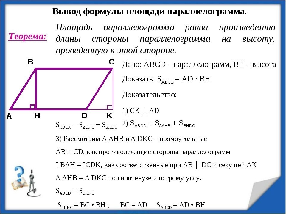 Четырехугольник, у которого противоположные стороны попарно параллельны, называется параллелограммом. Впараллелограммепротивоположные стороны равны, противоположные углы равны и сумма углов, прилежащих к одной стороне, равна .
