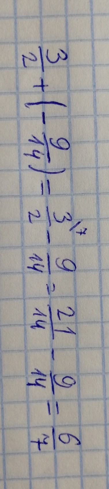 3/2 + (-9/14) = 3/2 - 9/14 = 21/14 -9/14 = 12/14 = 6/7
