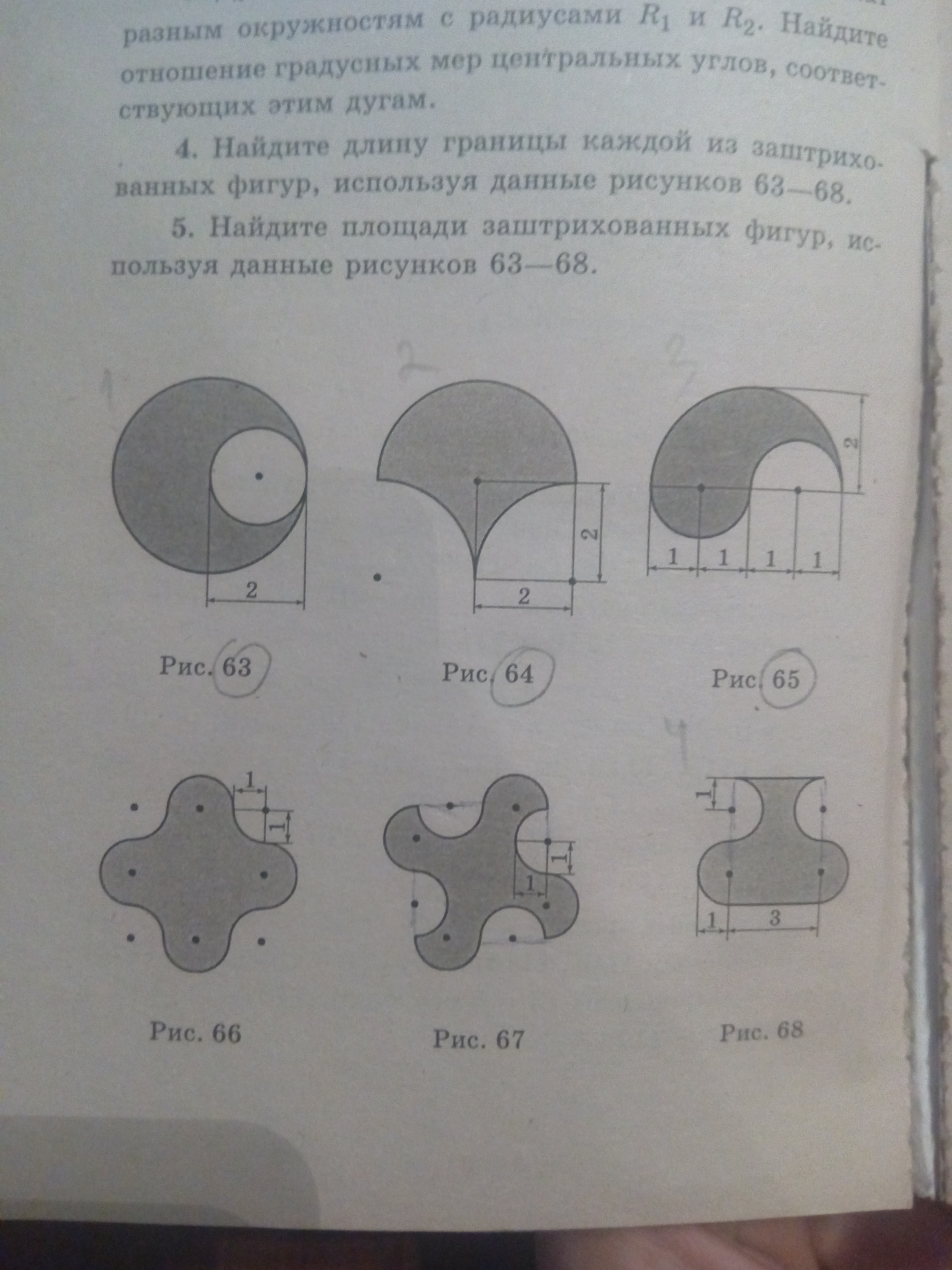 Срочно!!! Найдите площади заштрихованных фигур. Нужно сделать только рис. 63 рис. 64 рис. 65 рис. 68