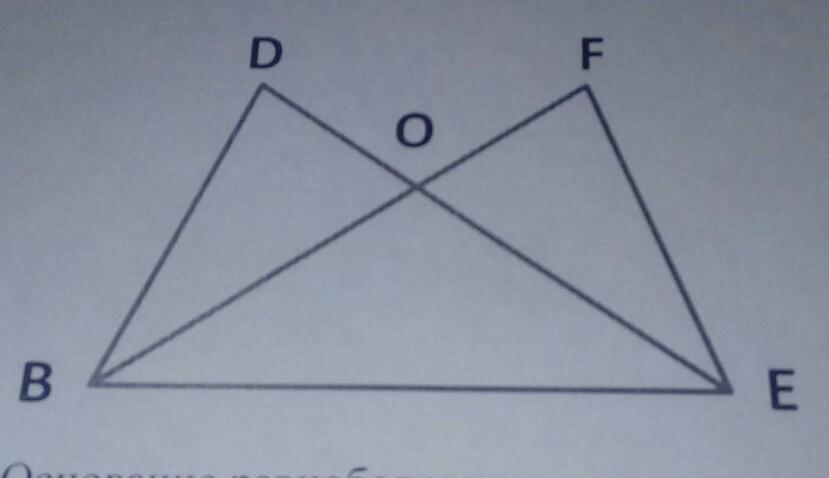 угол D= углу F, угол DOB=углу FOE(вертикальные), DO=OF=> треугольники DOB=FOE=>OB=OE=> треугольник ВОЕ -равнобедренный