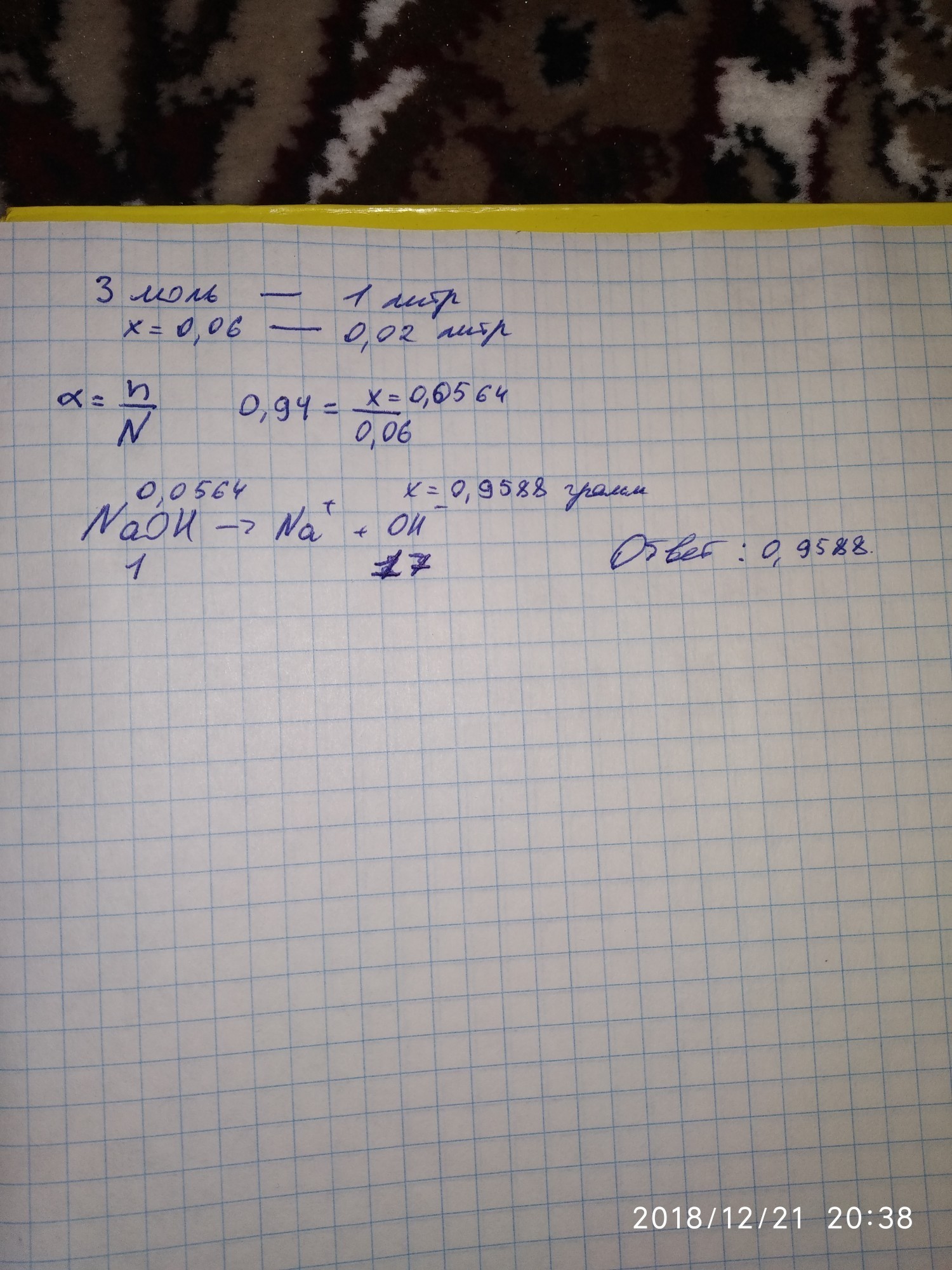 Определите массу гидроксид-ионов (г; до сотых), содержащихся в растворе объемом 20 мл с концентрацией натрий гидроксида 3 моль/л. Степень диссоциации щелочи 94%