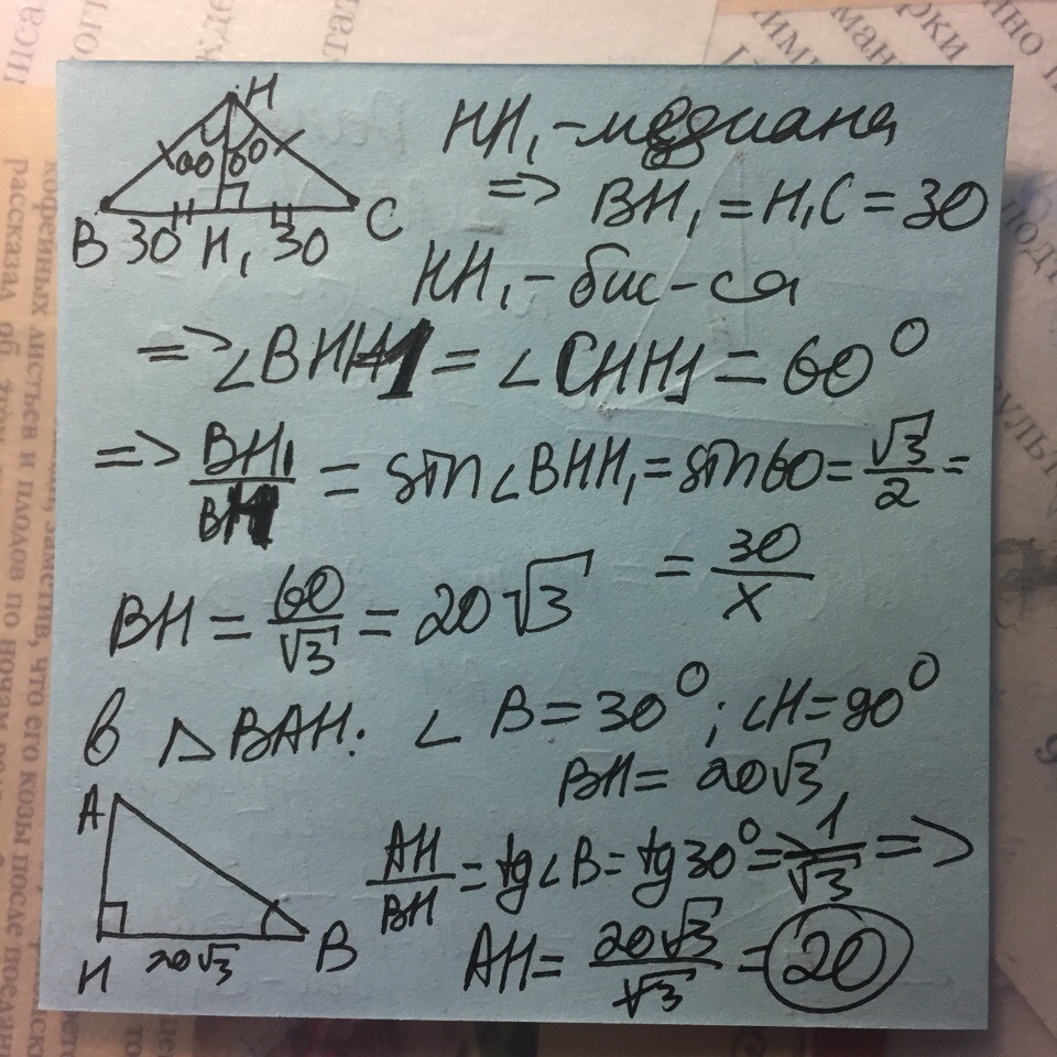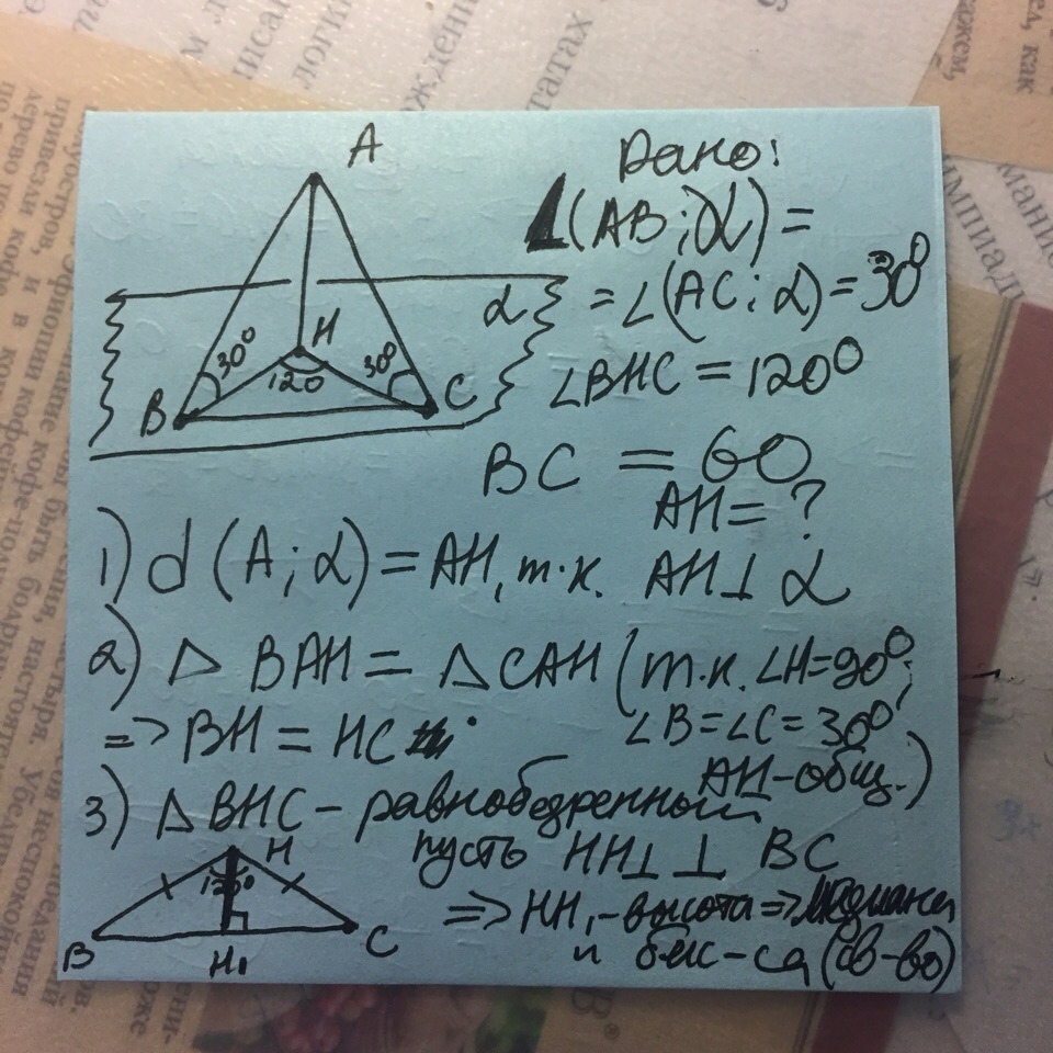 Из точки, взятой вне плоскости, проведены к плоскости альфа наклонные, каждая под углом 30 градусов к плоскости. Проекции этих наклонных образует между собой угол 120 градусов. Найти расстояние от точки до плоскости, если расстояние между основаниями наклонных ровно 60 сантиметров