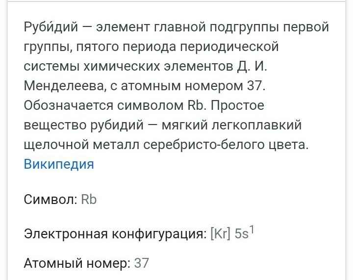 Руби́дий — элемент главной подгруппы первой группы, пятого периода периодической системы химических элементов Д. И. Менделеева, с атомным номером 37. Обозначается символом Rb (лат. Rubidium). Простое вещество рубидий — мягкий легкоплавкий щелочной металл серебристо-белого цвета.