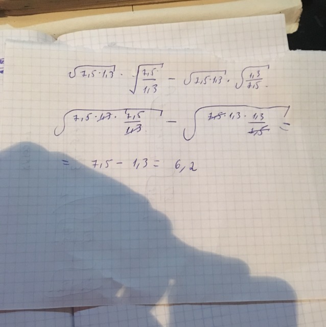 √7,5*1,3*√7,5/√1,3-√7,5*1,3*1,3/√7,5=7,5-1,3=6,2 (после сокращения)