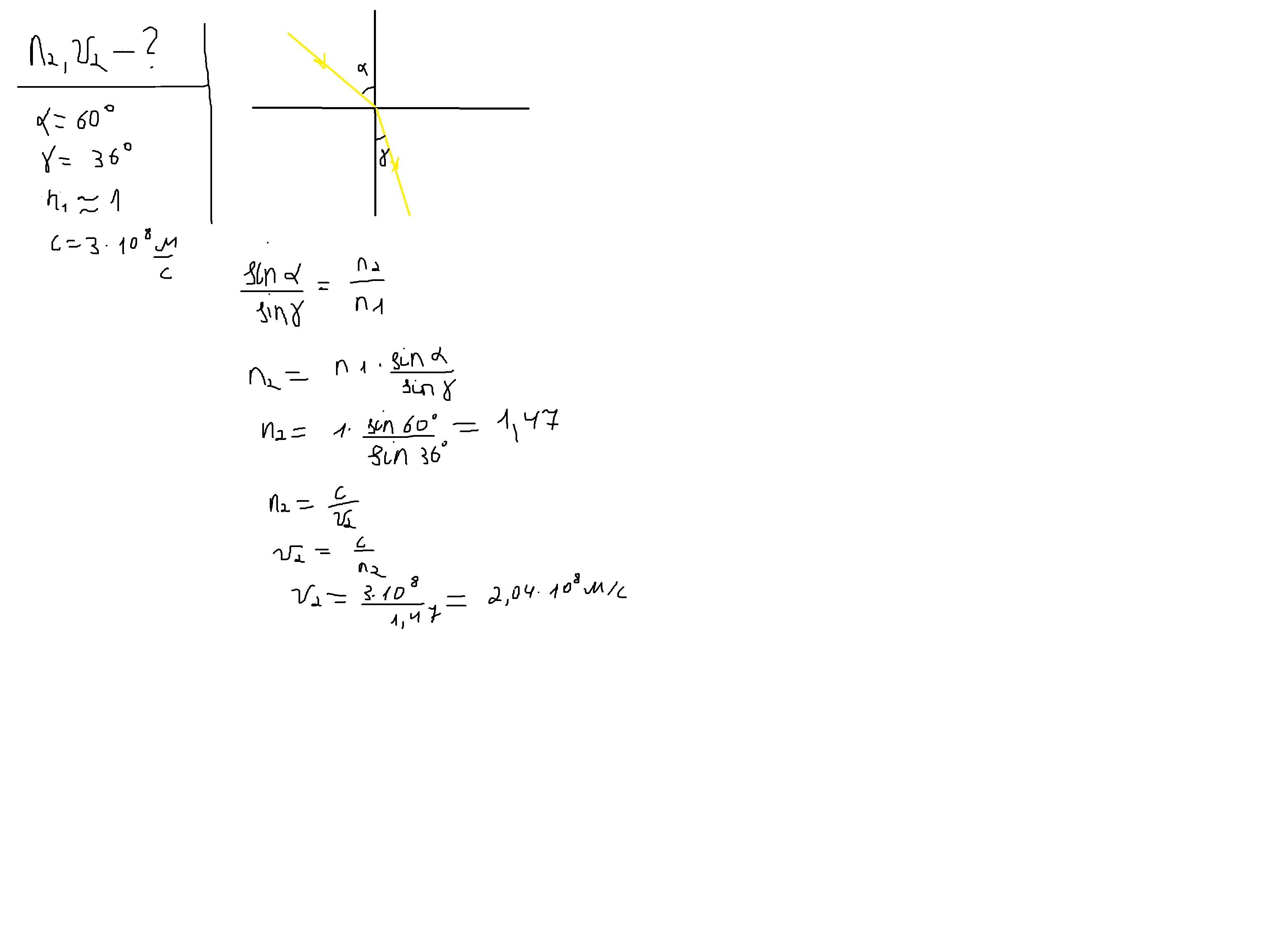 Угол падения луча света на поверхность подсолнечного масла 60°, а угол преломления 36°. Найти показатель преломления масла, если первая среда воздух. Определите скорость света в подсолнечном масле. Сделайте поясняющий чертеж.
