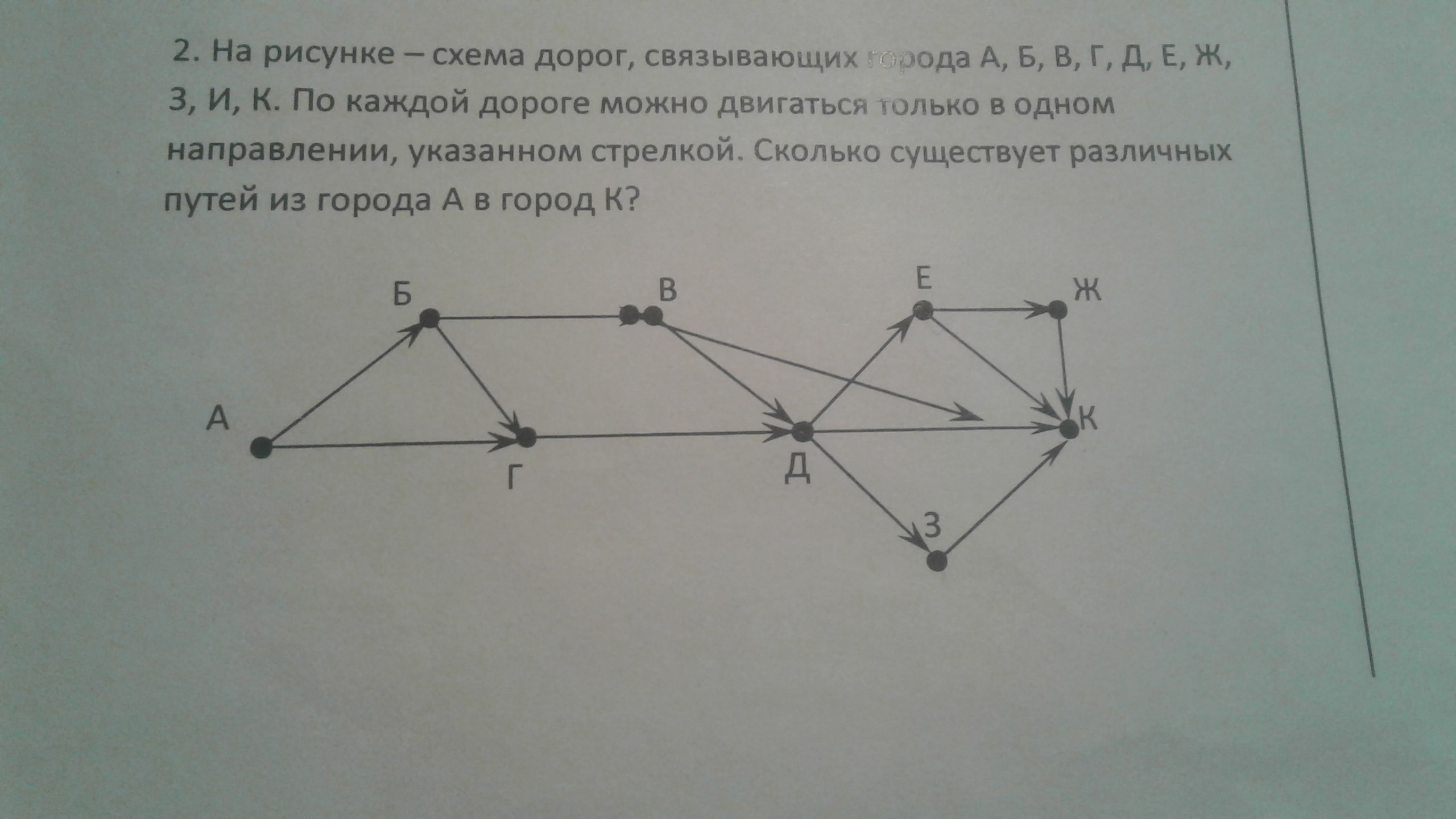 на рисунке схема дорог связывающих города а б в г д е ж з и к по каждой дороге можно двигаться только в одном направлении указанном стрелкой Сколько существует различных путей Из города А в город к