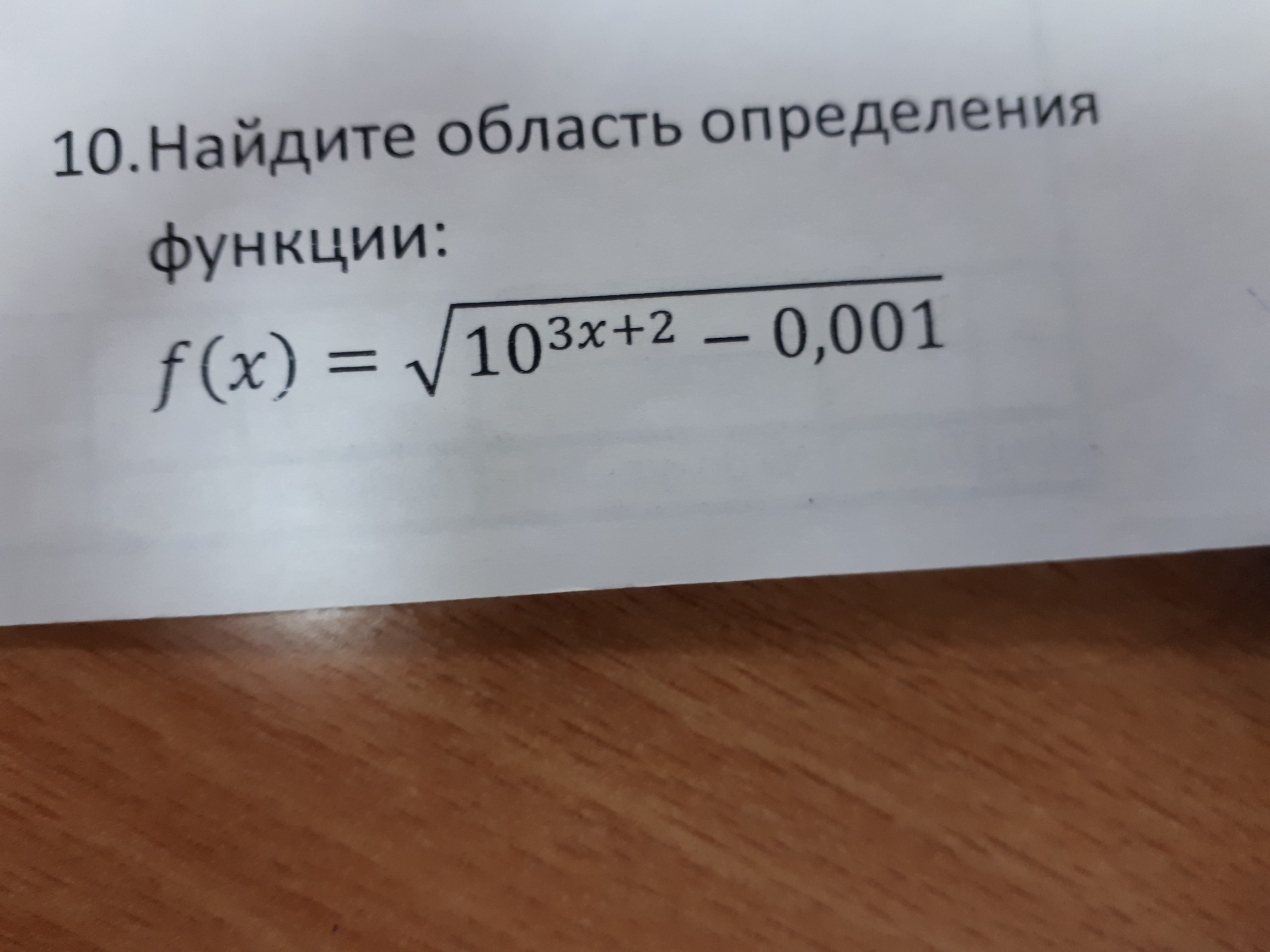 Ну смотри. У нас дано подкоренное выражение, которое никак не может быть отрицательным, иначе решить будет нельзя. Если не брать во внимание степень у 10, то по-любому , если вычитать из 10 0,001, получится число положительное. Но у нас степень. То есть, чтобы найти область определения, надо найти все недопустимые значения икса. То есть степень у числа 10 должна быть отрицательной. То есть 3х должно быть меньше нуля. Тогда х будет меньше нуля, то есть числом отрицательным. Тогда степень 3х+2 будет отрицательной, так как 3 , с каким бы множителем не стояла бы, всегда будет больше 2, а значит, в ответе будет знак тройки, в нашем случае, при х меньше нуля, знак минус, чего быть не может.