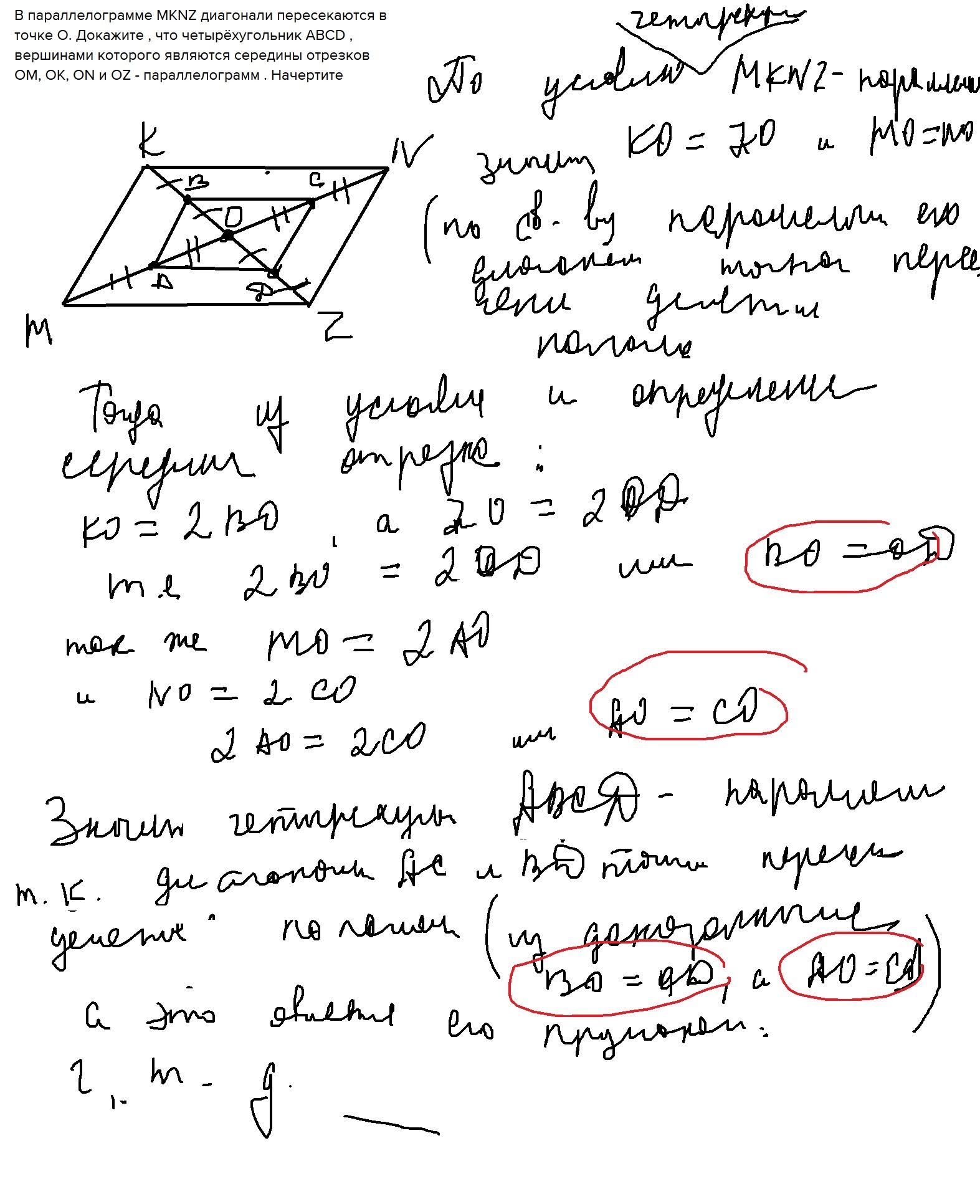 В параллелограмме MKNZ диагонали пересекаются в точке О. Докажите , что четырёхугольник АBCD , вершинами которого являются середины отрезков OM, OK, ON и OZ - параллелограмм . Начертите чертёж.