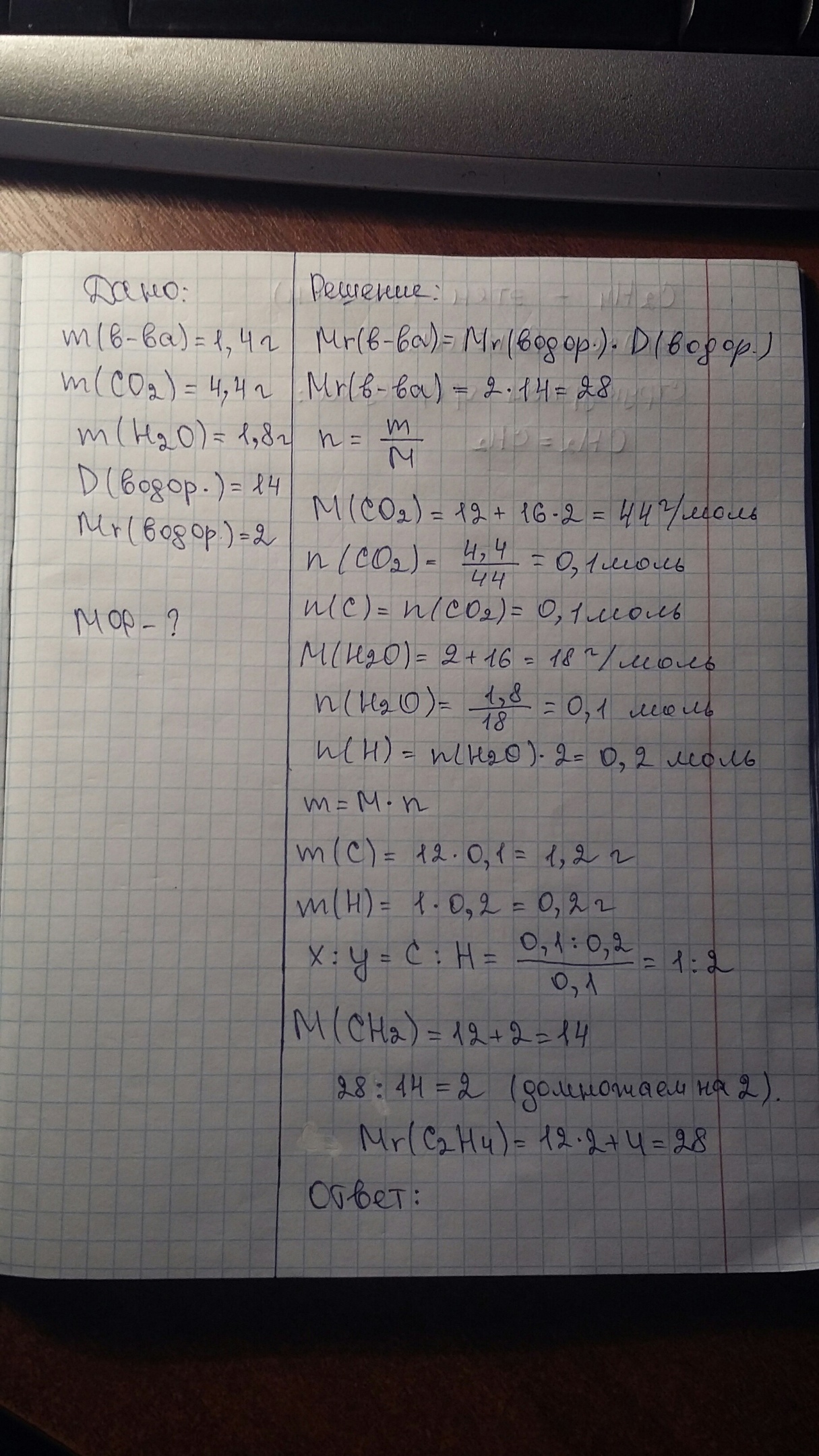 При полном сгорании 1,4 г вещества образовалось 4,4 г углекислого газа и 1,8 г воды. Плотность вещества по водороду равна 14. Найдите формулу вещества, укажите его название и строение