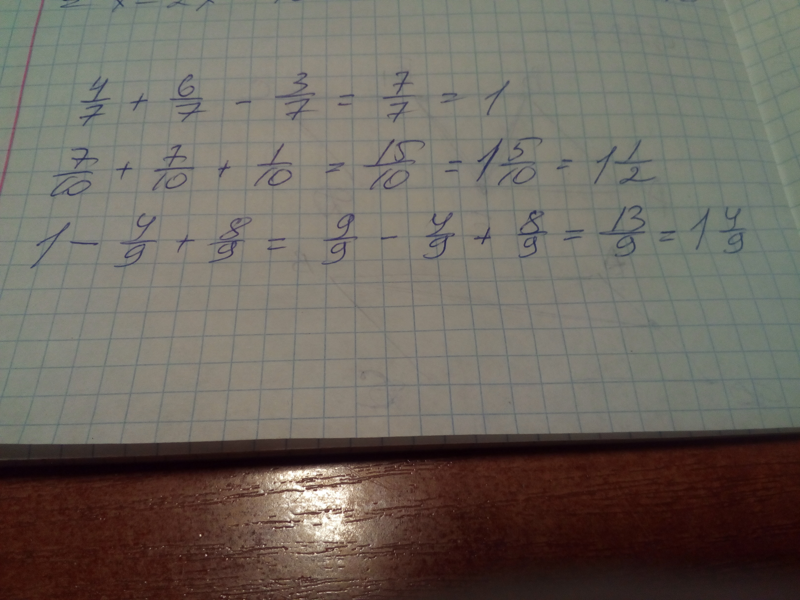 Выполнети действия и где возможно преоброзуйте дроби полученные в ответе 4/7+6/7-3/7 ,7/10+7/10+1/10, 1-4/9+8/9
