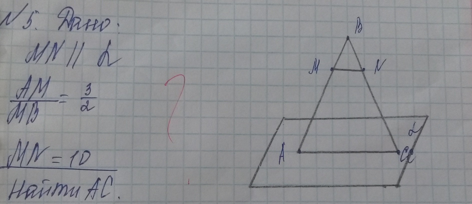 Тр-к МВN подобен тр-ку АВС, МN/АС=МВ/АВ, 10/АС=2/5, АС=5*10/2=25