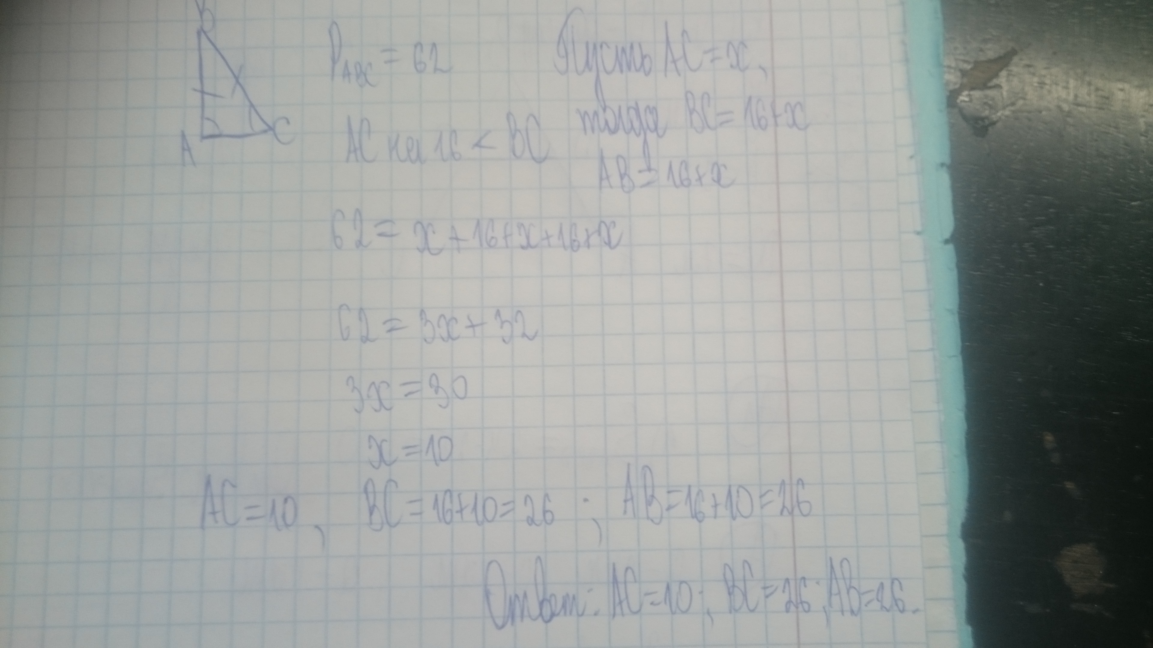 Периметр равнобедренного треугольника 62 см. Основание на 16 см меньше боковой стороны . Найдите все стороны. Помогите пожалуйста 20 баллов