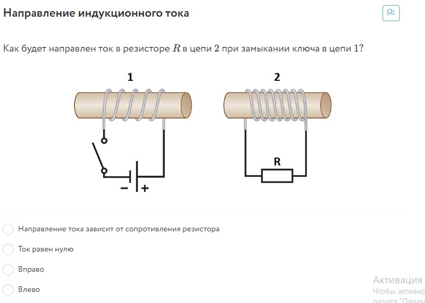 При замыкании ключа 1 катушка создает магнитное поле с полюсом N справа, во второй ток должен противодействовать изменению поля 1 катушки и слева в катушке 2 должен быть тоже N. А это будет если ток в R пойдет вправо.