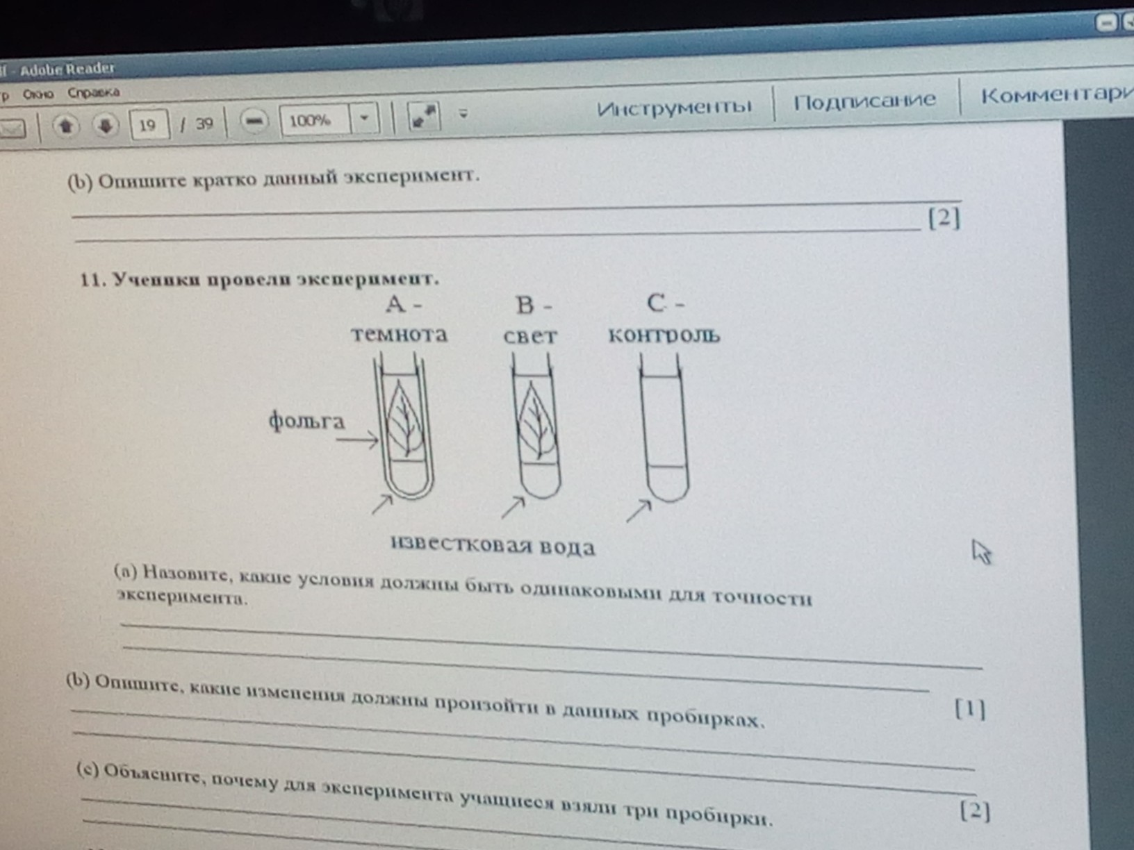 б) В первой пробирке, где листок находится в темноте из-за окружающей пробирку фольги, листок после его извлечения из пробирки окажется блеклым, вытянувшимся, а известковый раствор помутнеет, что указывает на образование нерастворимых солей карбоната кальция, т.к. растения в темноте выделяют углекислый газ. А если эксперимент продлится длительное время листок может погибнуть. Этот опыт указывает на необходимость света растению для правильного протекания все жизненно-важных для него процессов, и фотосинтеза в том числе. Во второй пробирке, где листок находится на свету и в третьей пробирке, где листка нет - ничего не произойдет.