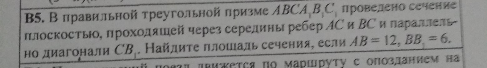 Пусть Р-середина АС, N- серединаСВ, РN=1/2FD=6, РN параллельна АВ,проведем NД параллельно СВ1 и ДМ параллельно АВ, соединим Р и М. РМДN-искомое сечение, равнобедр. трапеция, MД=АВ=12., Начерти отдельно равноб. трапецию и найдем ее высоту., Пусть РО и NТ ее высоты, тогда МО=ТД=3 Из тр-ка МРО РО ^2=МР^2-MO^2., Из тр-ка СВВ1 найдем СВ1 СВ1^2=CB^2+BB1^2=144+36=180 CB1=6V5, ND=1/2CB1=3V5, ND=МР, тогда РО^2=(3V5)^2-3^2=45-9=36 РО=6 Sтрап.=РN+МД /2*РО=12+6 /2 *6=54