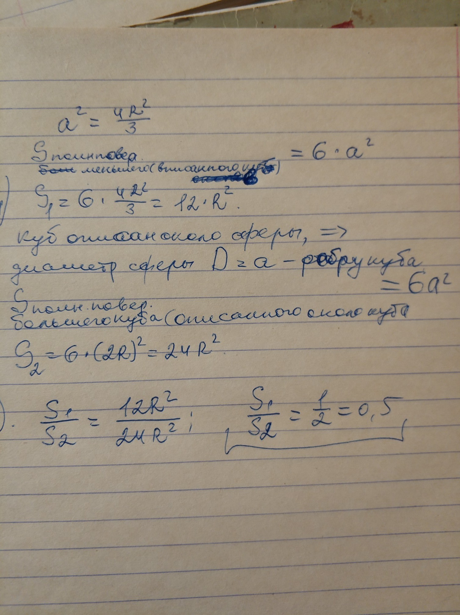 В сферу, радиус которой равен R, вписан куб. Вокруг этой же сферы описан куб. Найдите отношение площади полной поверхности меньшего куба к площади полной поверхности большего куба.
