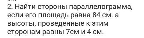 Площадь параллелограмма расчитывается по формуле S=a×h, где а - величина основания, h - высота параллелограмма. Подставляя в формулу данные, можем найти величину сторон: