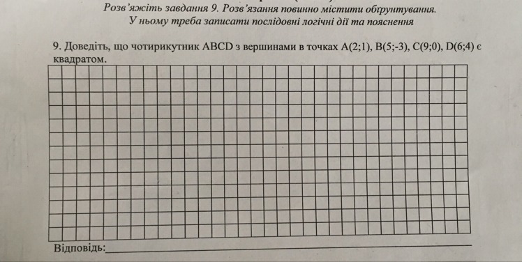 докажите, что четырехугольник ABCD с вершинами в точках А (2;1), B(5;-3), C(9;0), D (6:4) является квадратом