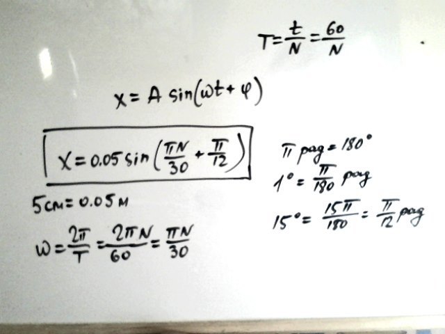 Запишите уравнение гармонического движения материальной точки, совершающей колебания с амплитудой А = 5 см, если за время t = 1 мин совершается N полных колебаний, а начальная фаза φ = 15 ͦ.