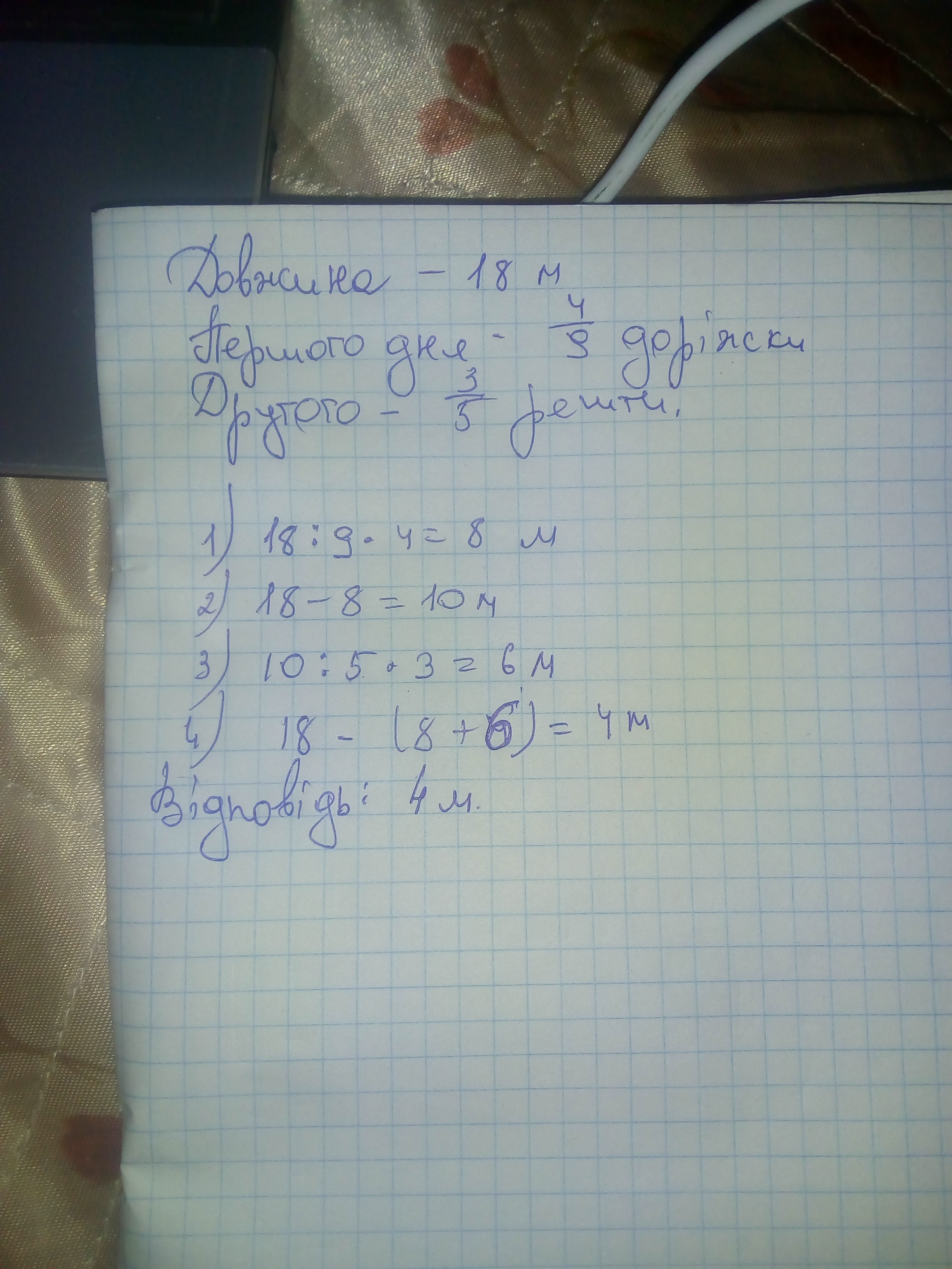 Довжина доріжки в саду дорівнює 18 м. Першол дня замостили плиткою 4 9 доріжки а другою 3 5 решти Скілюки метрів доріжки залишилося замостити плиткою ?