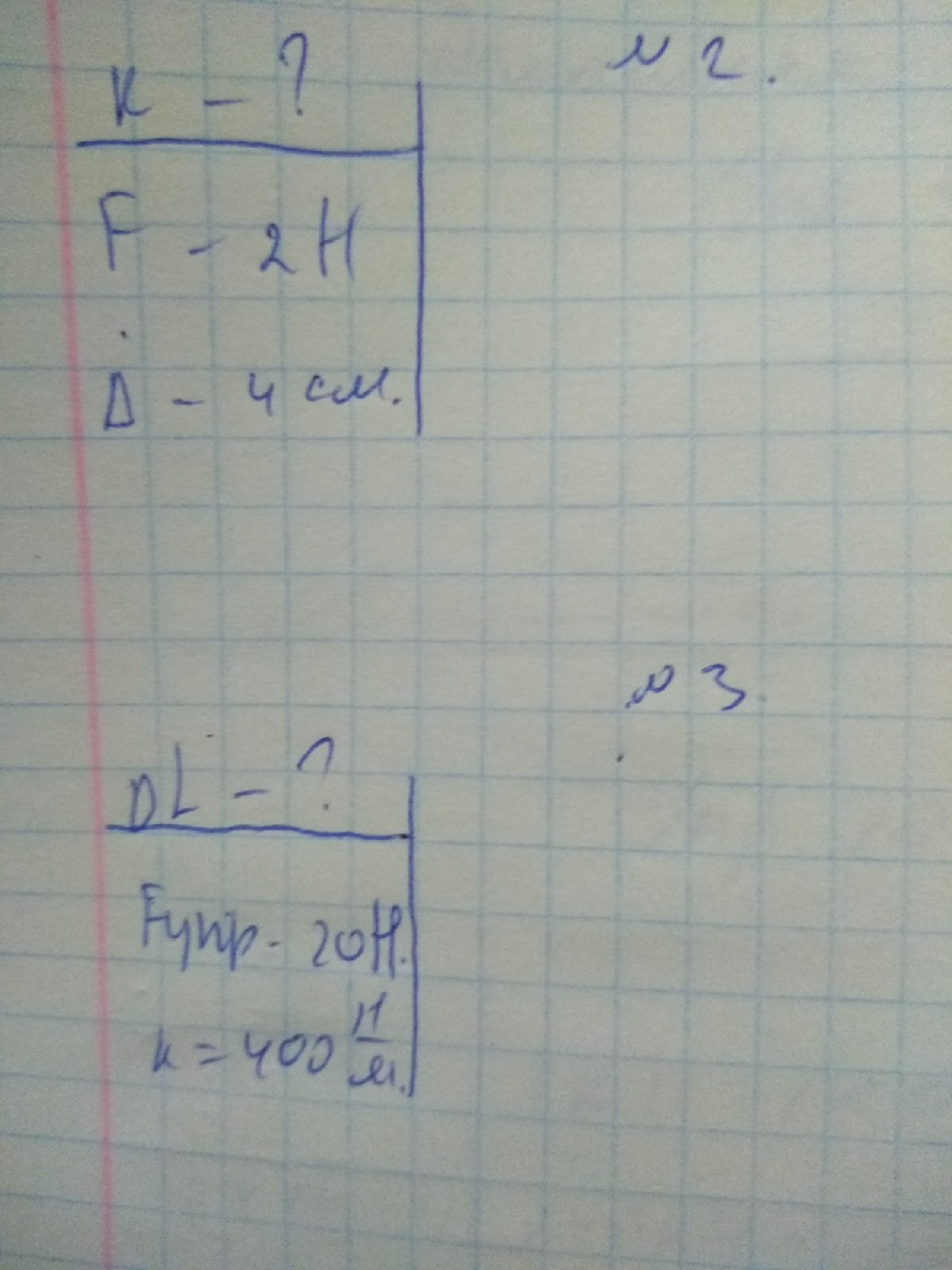 3) ΔL=F/k=20/400=0.05 м (5 см)