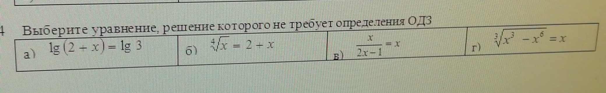 выберите уравнение, решение которого не требует определения ОДЗ(во вложении)
