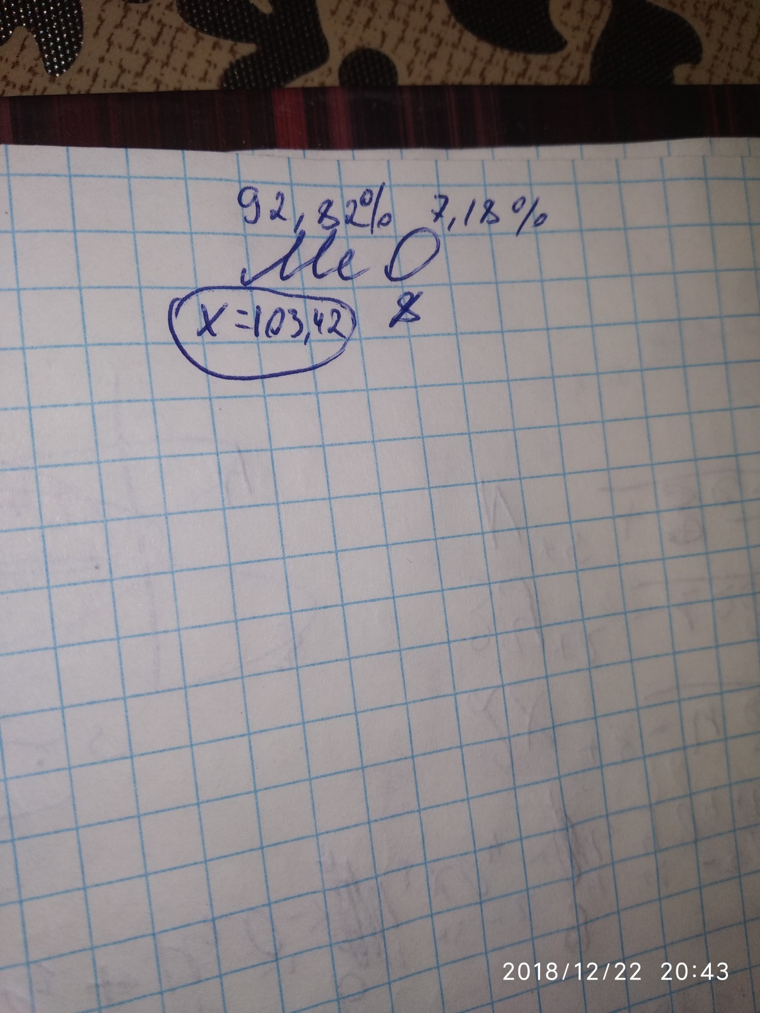 Вычислить эквивалентную массу металла, зная, что его оксид содержит 92,82 % металла и 7,18% кислорода. Ответ:103,42 г/моль