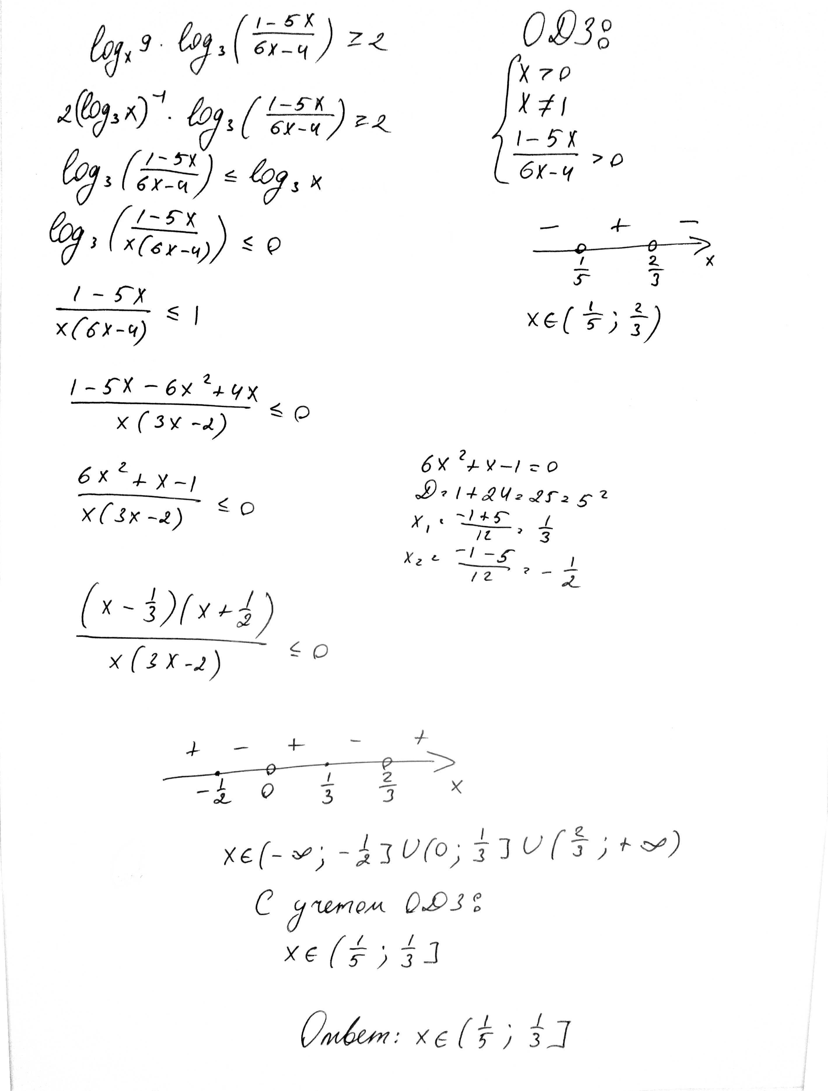 Пояснения к переходу со второй строчки к третьей: Выражение log₃x отрицательно на промежутке ОДЗ x∈(1/5; 2/3), поэтому, умножая неравенство на log₃x, переворачиваем знак.