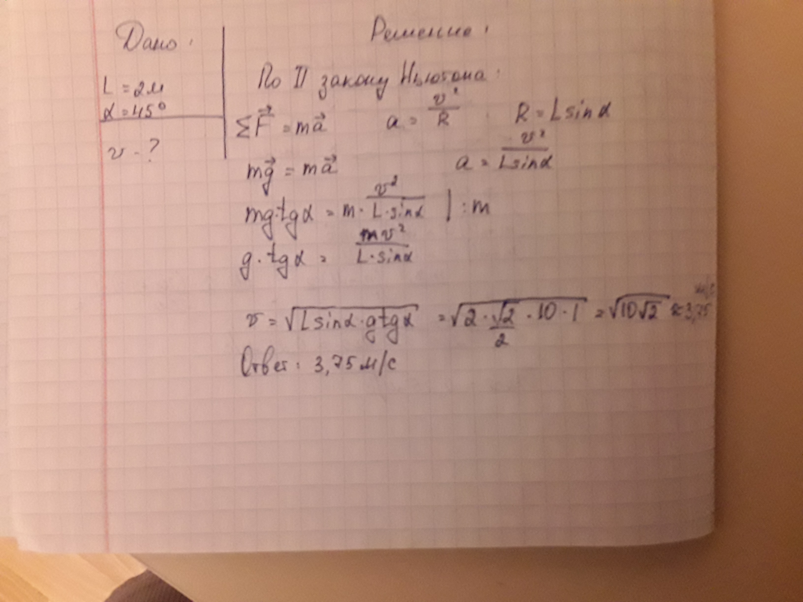 Конический маятник длинно 2м при вращении в горизонтальной плоскости отклоняется от вертикали на 45 градусов. Чему равна линейная скорость шарика ?