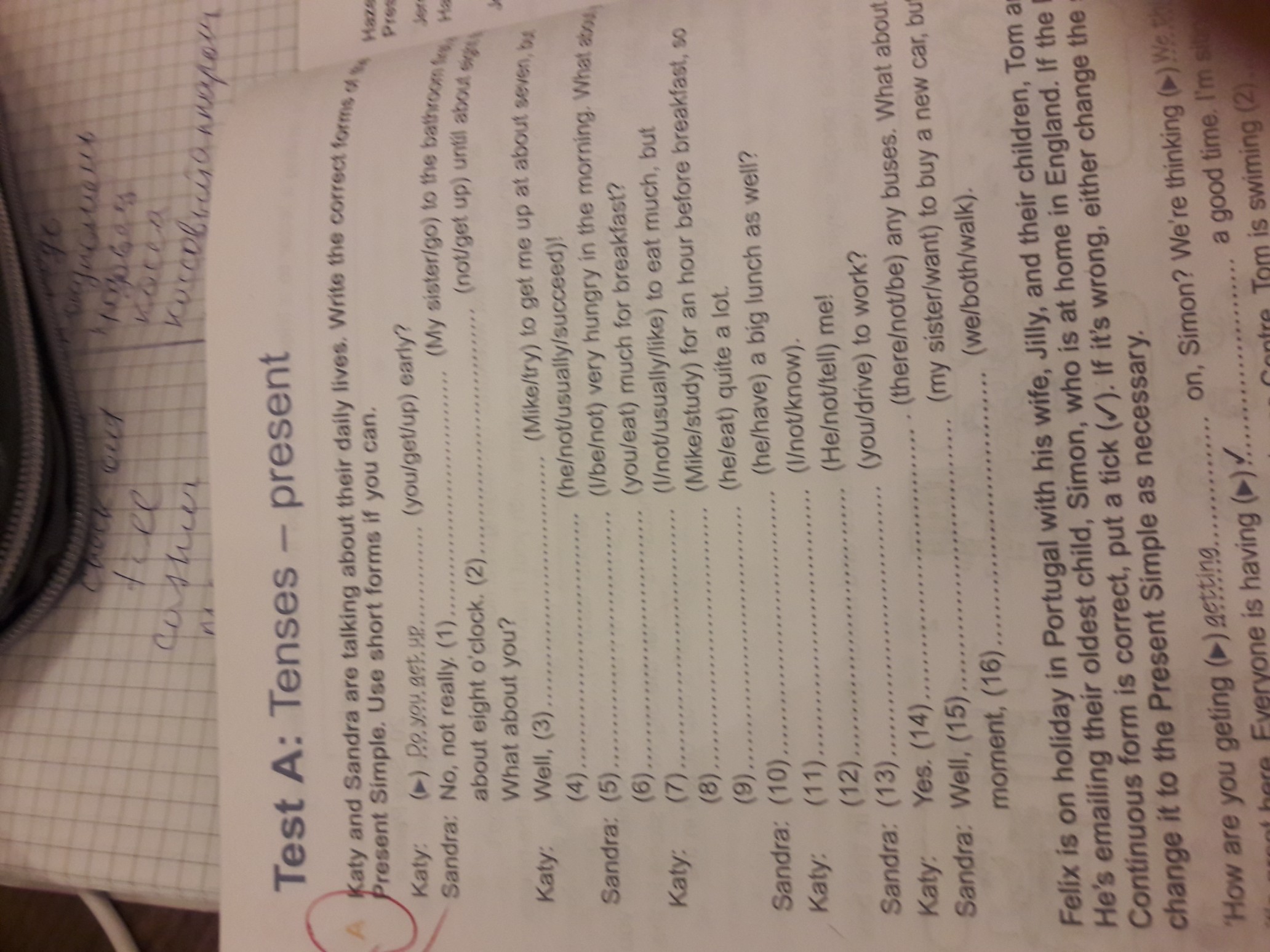 1 my sister goes, 2 don't get up, 3 Mike tries, 4 he doesn't usualy succed,5 I don't be,6 Do you eat,7 i don't usualy like,8 Mike studies, 9 he eats, 10 Does he have,11 i don't know,12He doesn't tell me,13 Do you drive, 14 There don't be, 15 My sister wants,16 We both walk