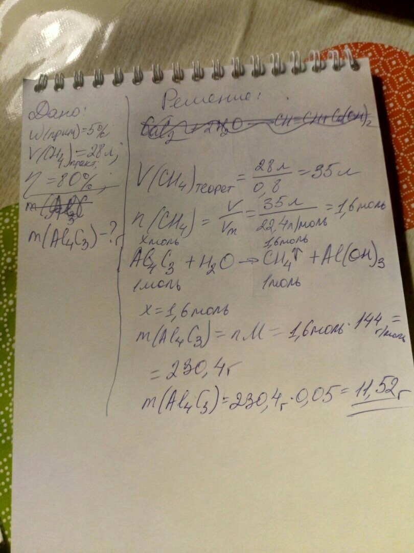 Найти массу технического карбида алюминия, содержащего 5% примесей, необходимого для получения 28 л метана (при н.у.), если доля его выхода составляет 80% от теоретически возможного.