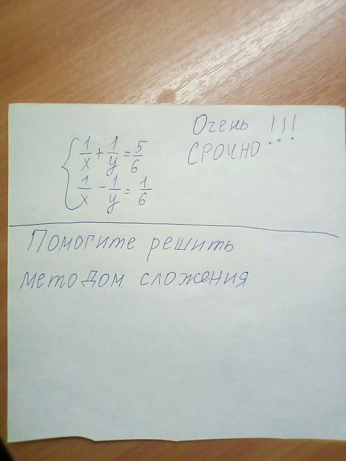 left { {{frac{1}{x}+frac{1}{y}=frac{5}{6}} atop {frac{1}{x}-frac{1}{y}=frac{1}{6}}} right.oplus ominus left { {{frac{2}{x}=frac{6}{6}} atop {frac{2}{y}=frac{4}{6}}} right. ; ; left { {{x=2} atop {y=3}} right.