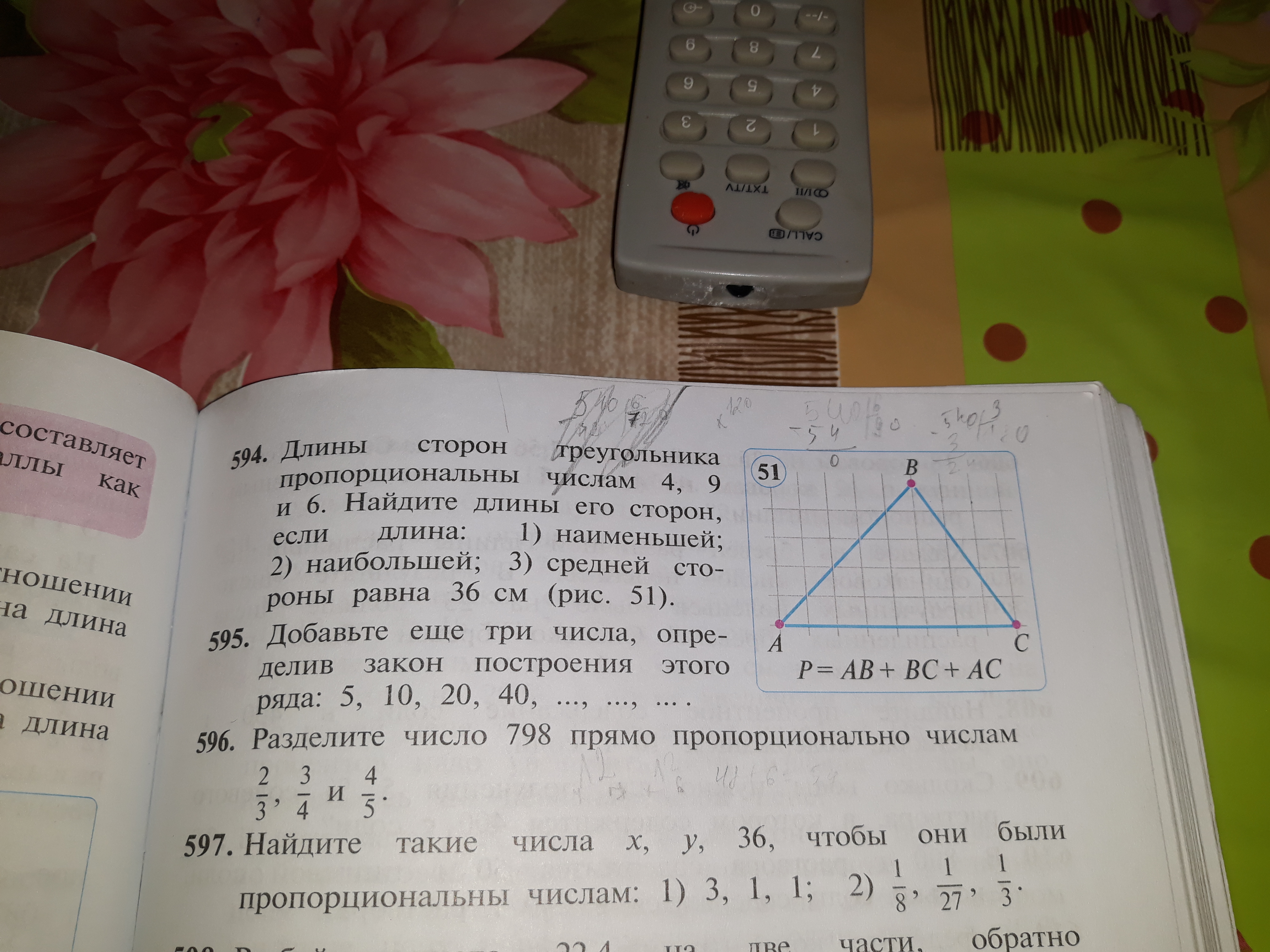 a : 36 : c = 4 : 9 : 6 ⇒ (36/9 = 4 - коэффициент пропорциональности) 16:36:24 (13 см, 36 см, 24 см)