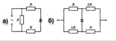 для схемы б) имеем уравновешенный мост, ток через диод не идёт. Ток верхней ветки и нижнеё ветки равен: I=U/4R=12/480=0.025a, мощность Р=UI=12*0.05=0.6вт