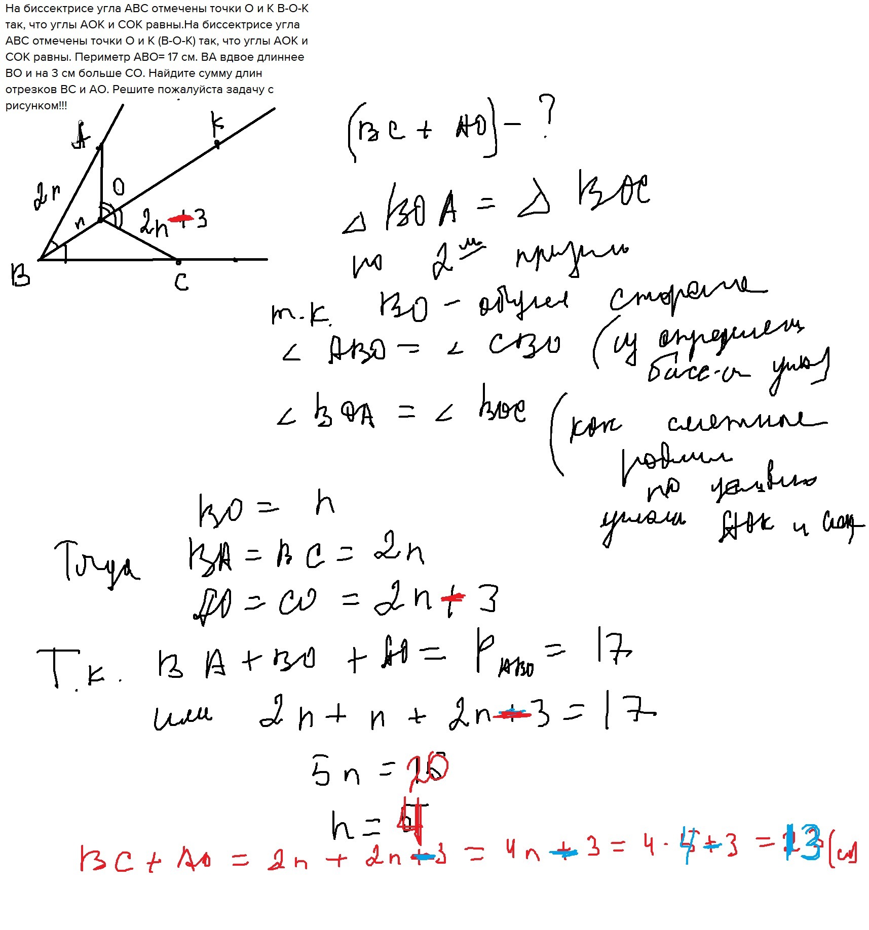 На биссектрисе угла АВС отмечены точки О и К В-О-К так, что углы АОК и СОК равны.На биссектрисе угла АВС отмечены точки О и К (В-О-К) так, что углы АОК и СОК равны. Периметр АВО= 17 см. ВА вдвое длиннее ВО и на 3 см больше СО. Найдите сумму длин отрезков ВС и АО. Решите пожалуйста задачу с рисунком!!!