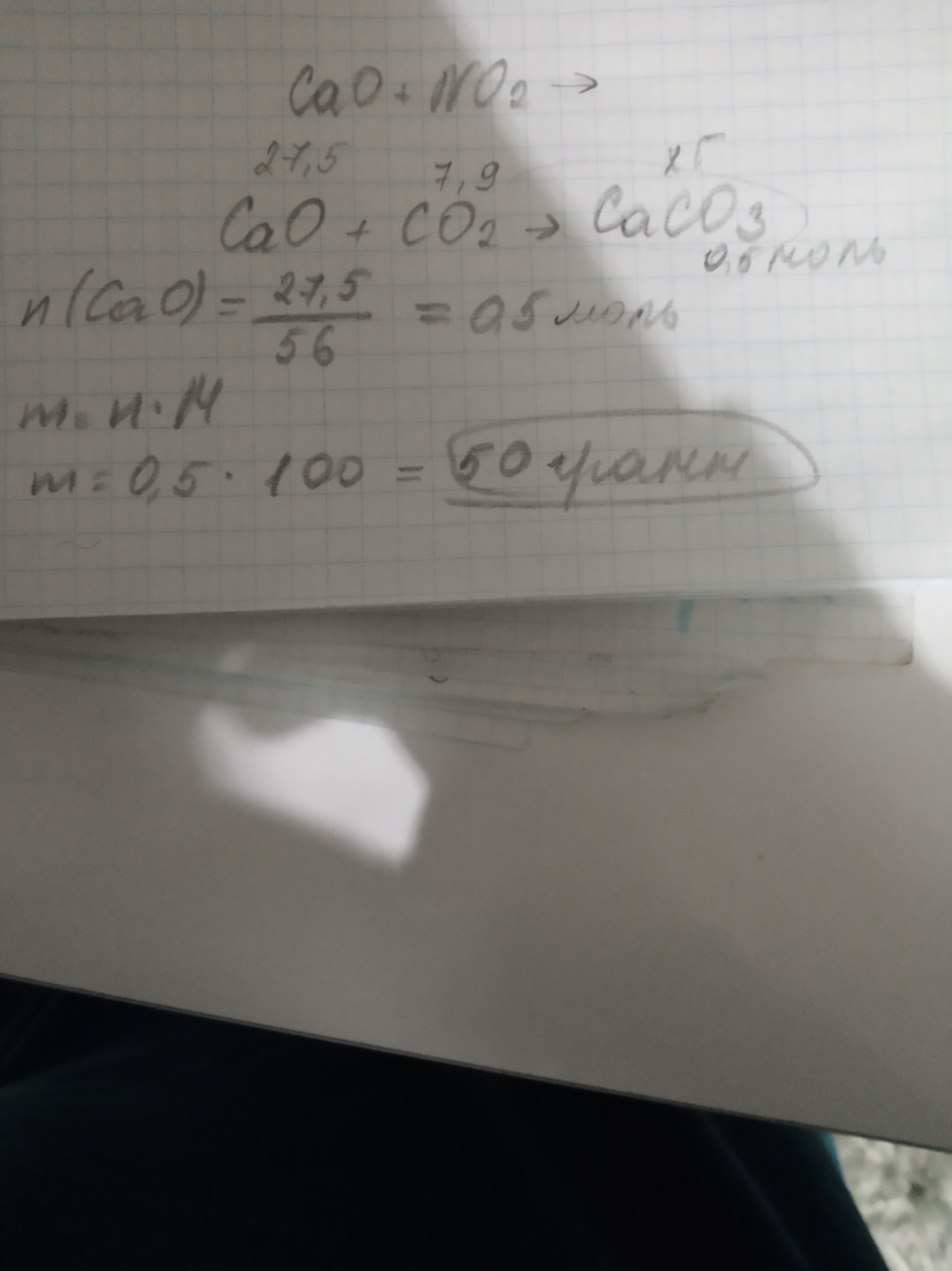 рассчитайте массу осадка ,который получился при взаимодействии 27,5 г оксида кальция и 7,9 г оксида углерода4