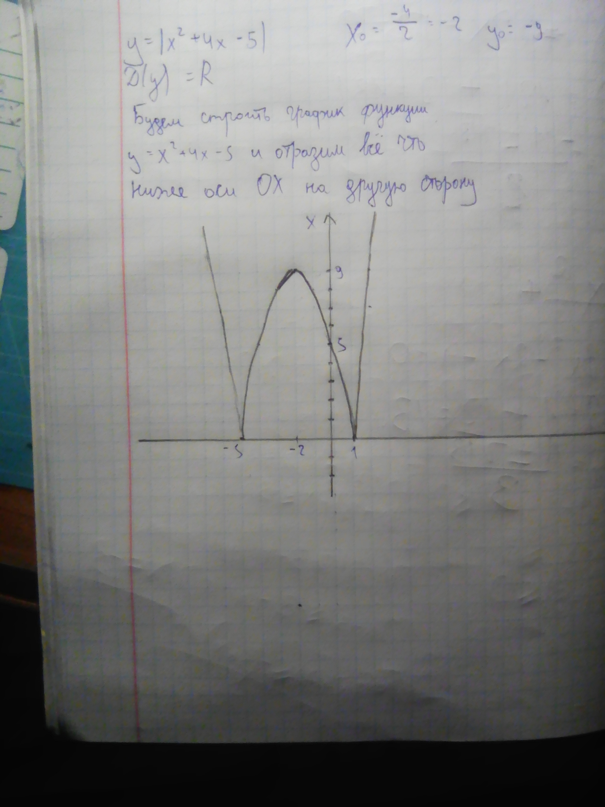 Постройте график функции y = |x^2 + 4x -5|. Какое наибольшие число общих точек график функции может иметь с прямой, параллейной оси фбцисс ?