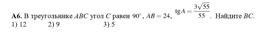 A6. ∠ABC=90° AB=24 tg(∠A)=3*√55/55=3/√55. BC=?