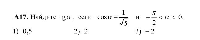 A17. cosα=1/√5 -π/2<α<0 (четвёртая четверть) sinα<0. tgα=?